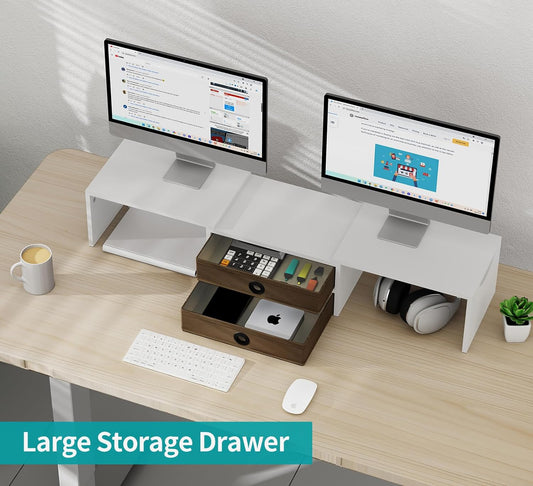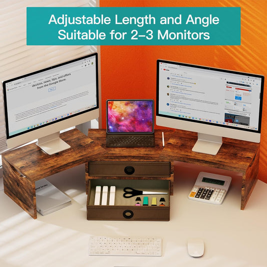 Zimilar Dual Monitor Stand Riser with 2 Drawers, Wood Monitor Riser for 2 Monitors, Length and Angle Adjustable Monitor Stand with Storage, Desktop Organizer Stand for Computer,Laptop,Printer
