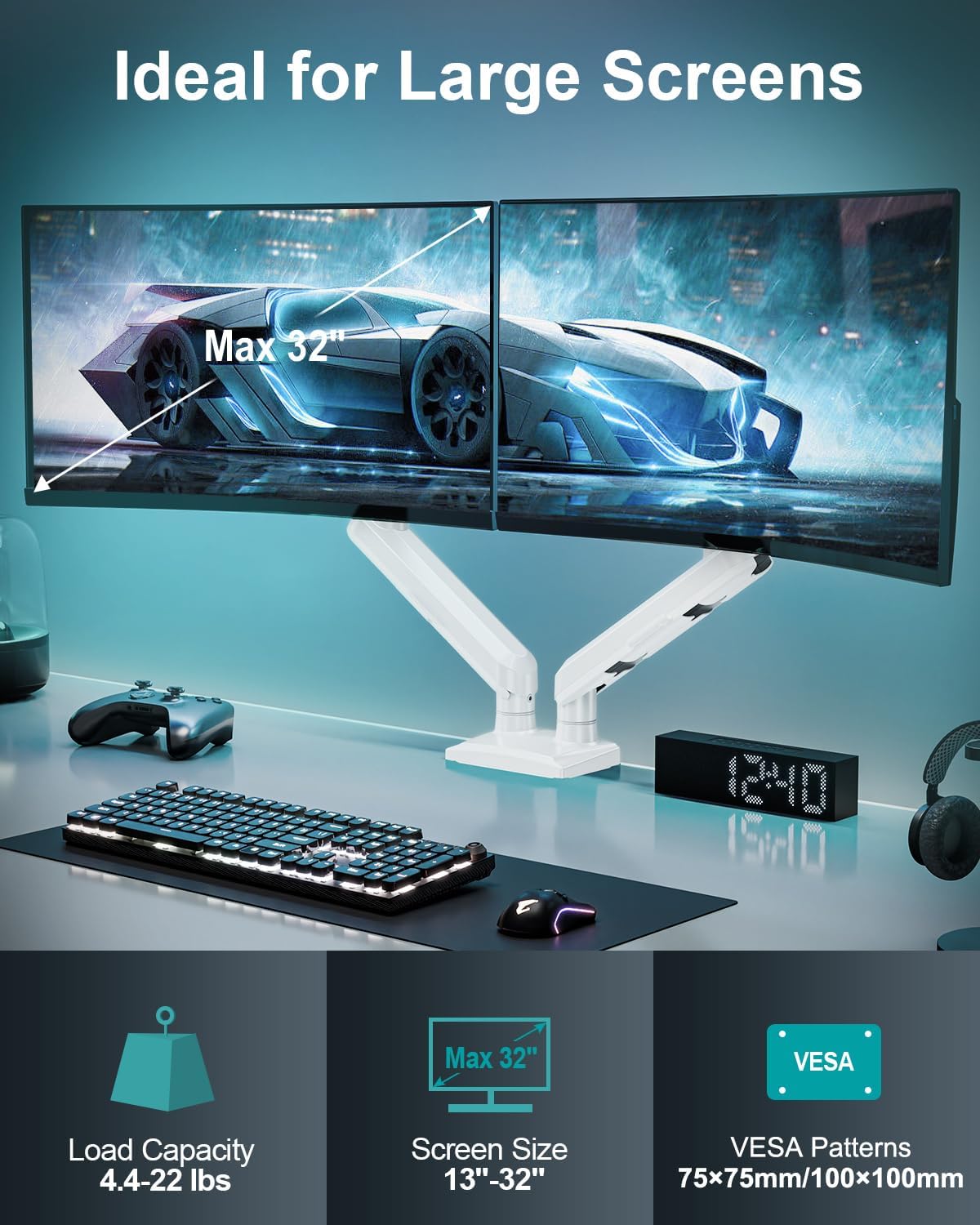 - Universal Monitor Stand: Our dual monitor arm perfectly fits most flat or curved LCD/LED screens ranging from 13" to 32", with a max load capacity of 22 lbs for flat/curved screens, suitable for VESA patterns of 75x75mm & 100x100mm. Compatible with ASUS, Acer, Samsung, LG, AOC, Dell, etc., including but not limited to 32, 30, 28, 27, 25, 24, 23, 22, 21, 20, 19, 17inch monitors.