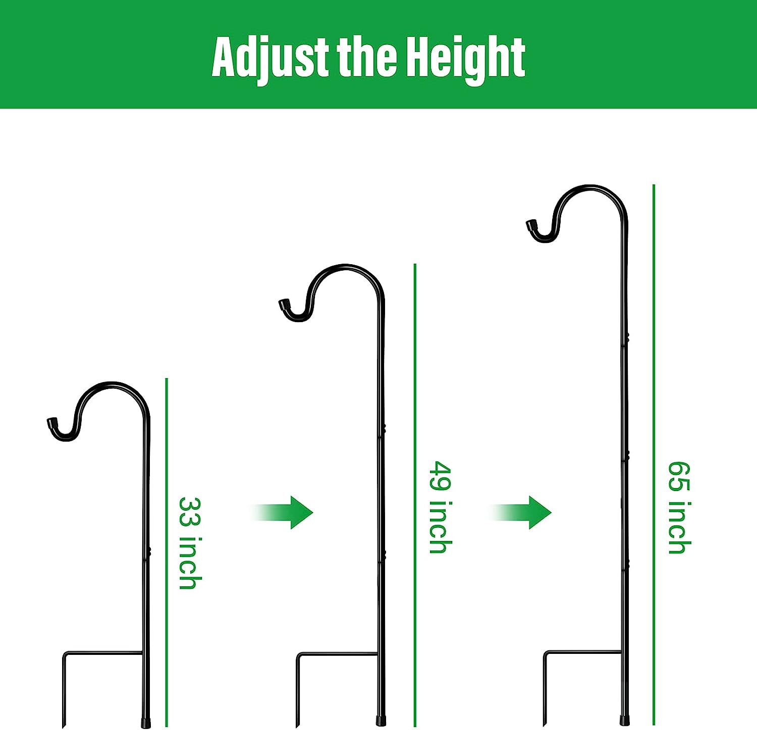- 【Adjust Height】33'' & 49'' & 65'' Three different heights to meet your different needs. Each garden hook includes 2 extender for three height options, it varies in height depending on how many extenders are used. The hooks can measure up to 65” depending on what you would like to hang and how much you would like it to stand out.