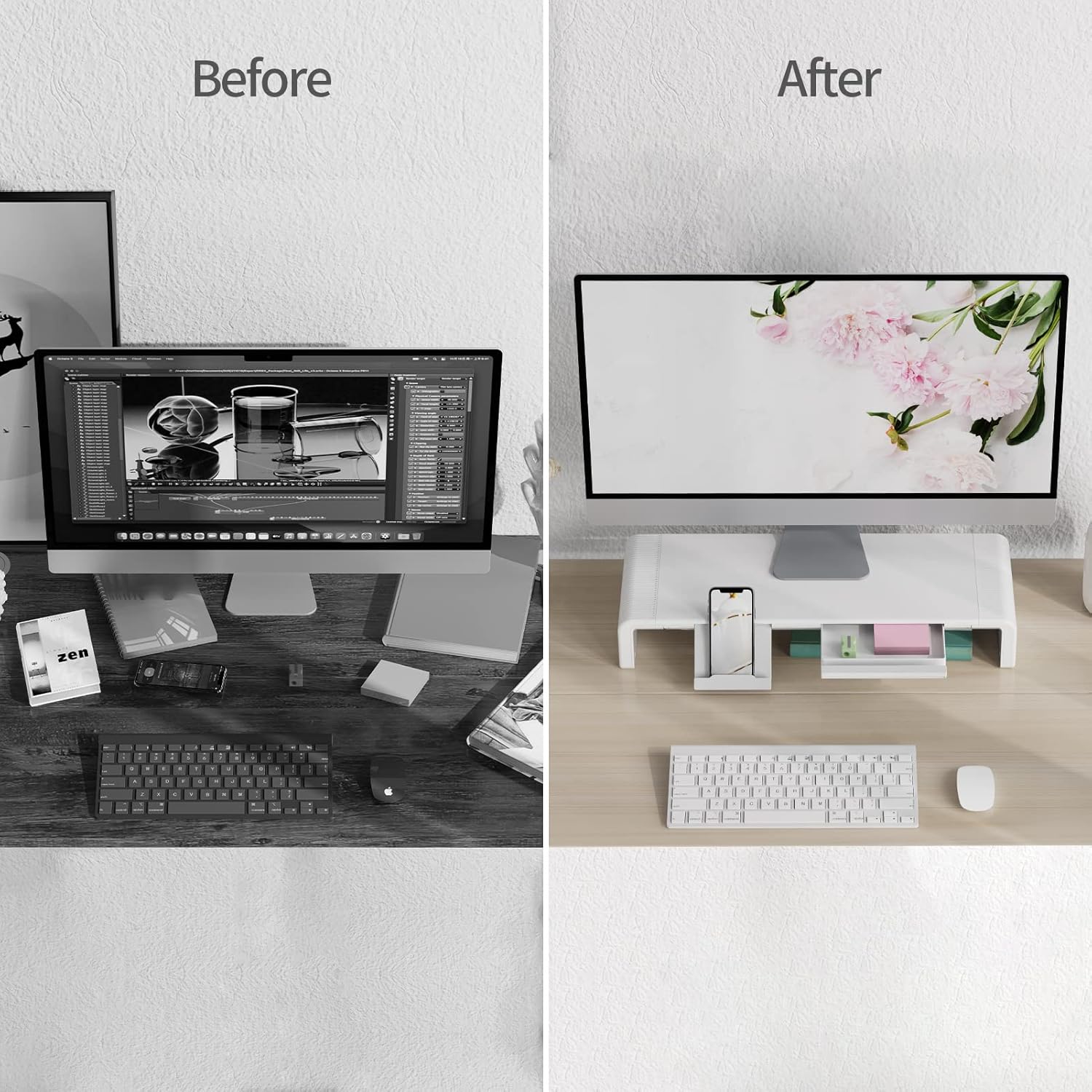 The ergonomic monitor stand can elevate computer monitors to an ergonomic viewing height, effectively improves posture to relieve eye-strain, back & neck pain throughout the workdays.