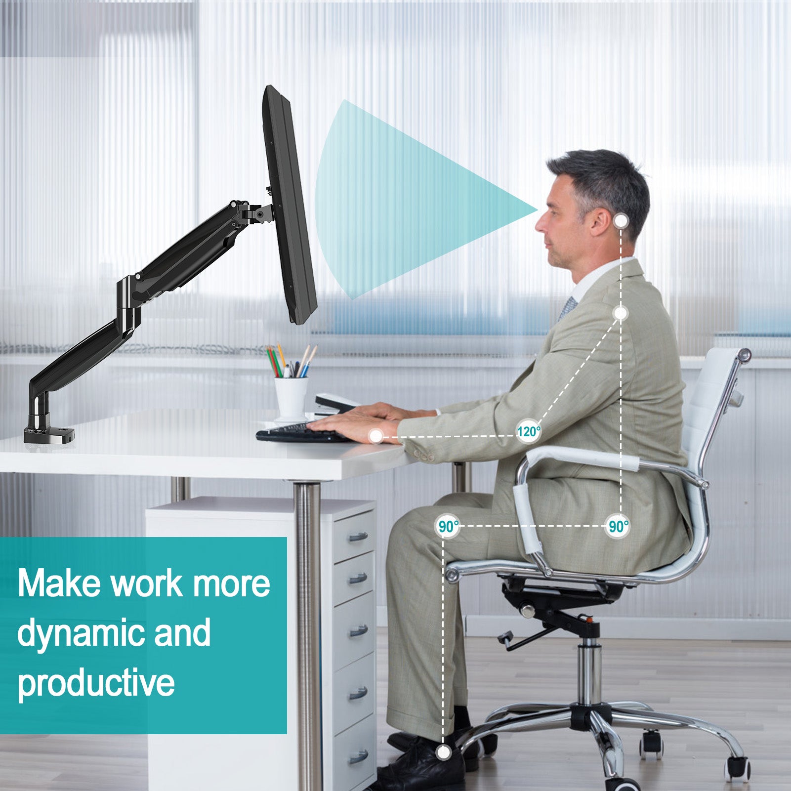 - Comfortable Ergonomics Design - The full motion monitors arm can tilt +90°to -45°,swivel 180°and rotate 360°freely switch between horizontal and vertical modes, optimize your view and provide the best viewing angle while working or home applications.