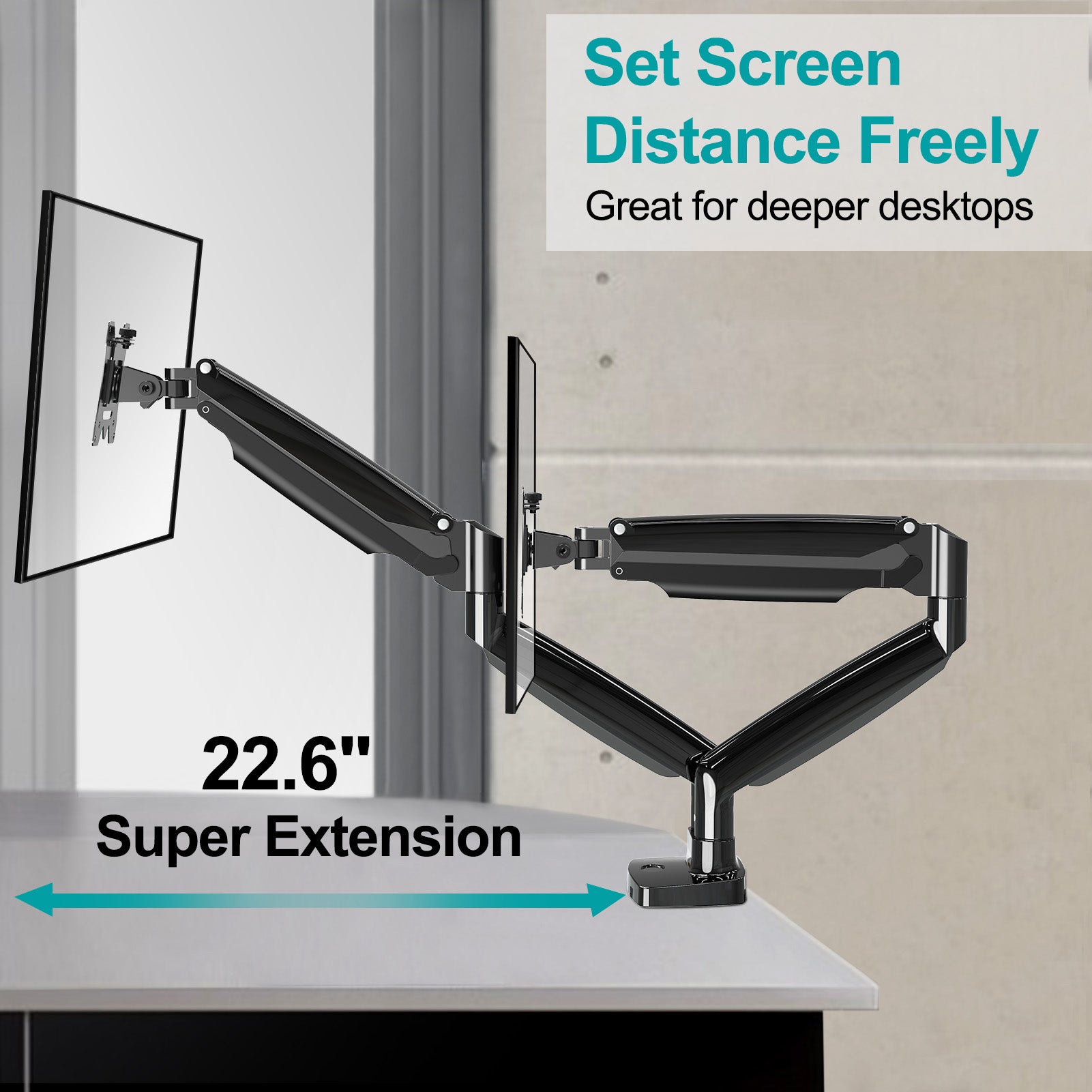 - Longer and Higher Monitor Arm - This dual computer monitor stand comes with Gas Spring Adjustable arms that extend up to 22.6" which is perfect for larger desktops. It can be easily raised up to 19.7", providing you with more comfortable height adjustment, relaxing your neck, back and shoulder.