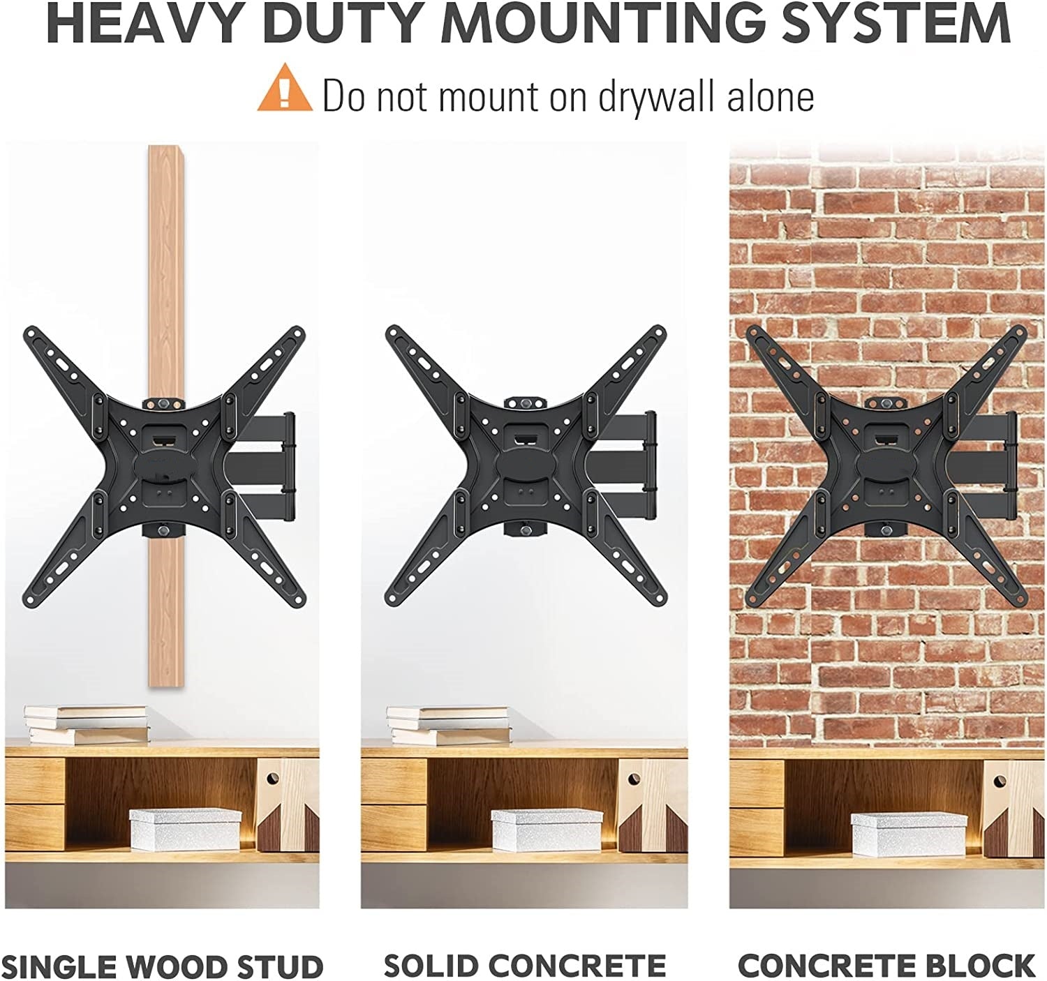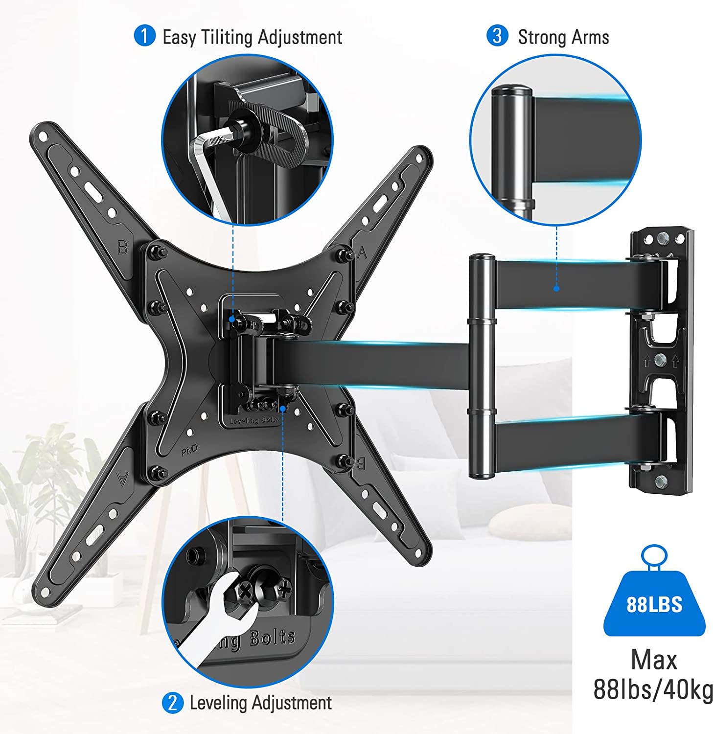 - Universal TV Wall Mount: Our articulating TV mount fits most 26-55 inch LED LCD OLED TVs with VESA patterns ranging from 100x100 mm to 400x400 mm and holds up to 88 lbs./40 kg. Designed for single stud, brick, and concrete walls, not for drywall alone application!