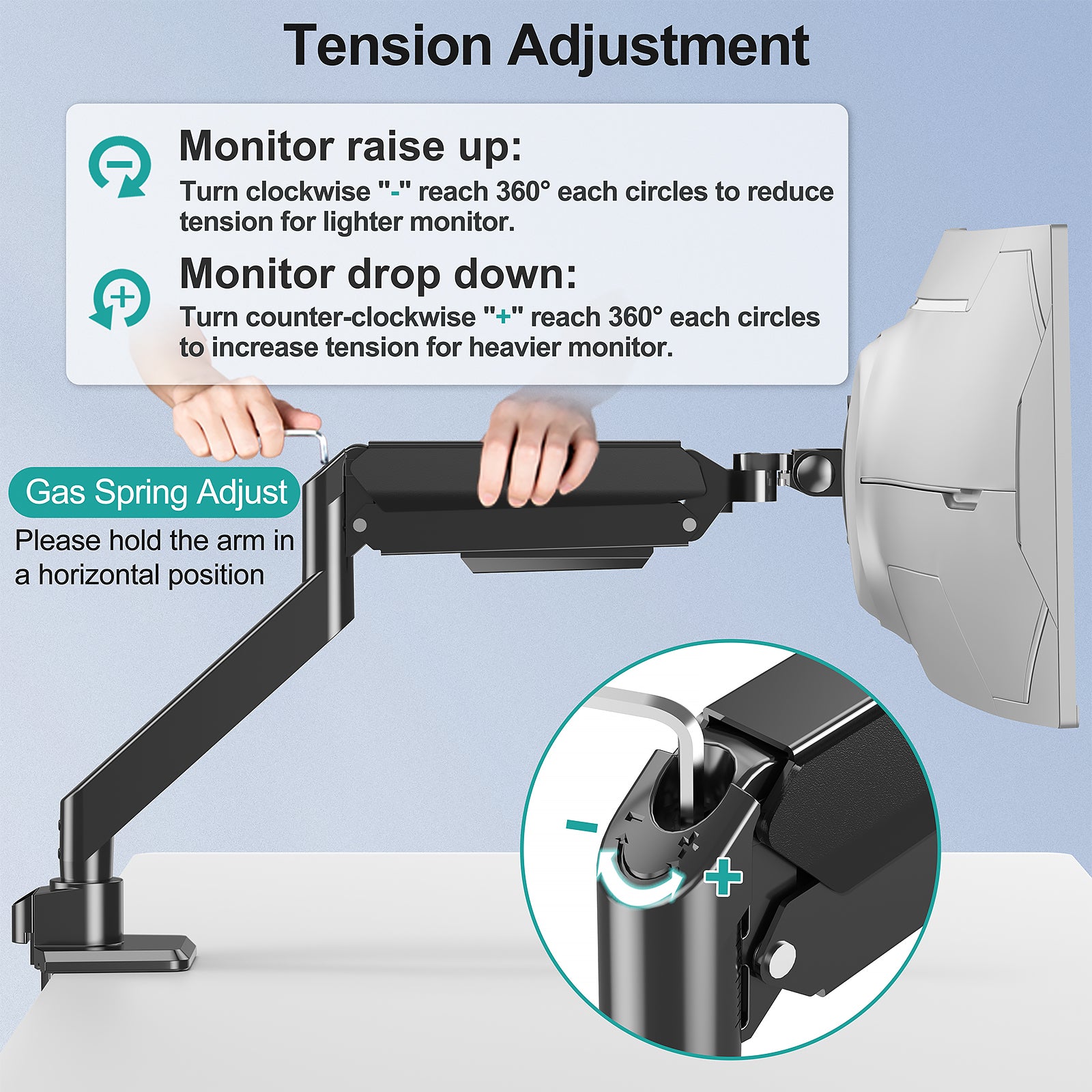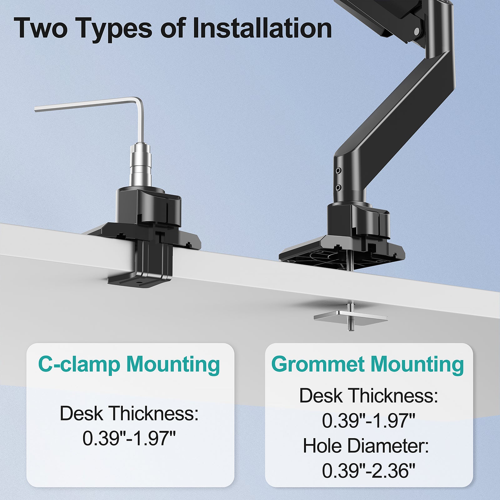 - 2 Mounting Options - This ultrawide monitor arm works on desks from 0.39" to 2.97" thick, you can choose clamp mounting or grommet mounting depending on the desk situation. We provide all the accessories needed for installation and adjustment, as well as a detailed instruction manual for easier installation, ensuring a hassle-free using experience.