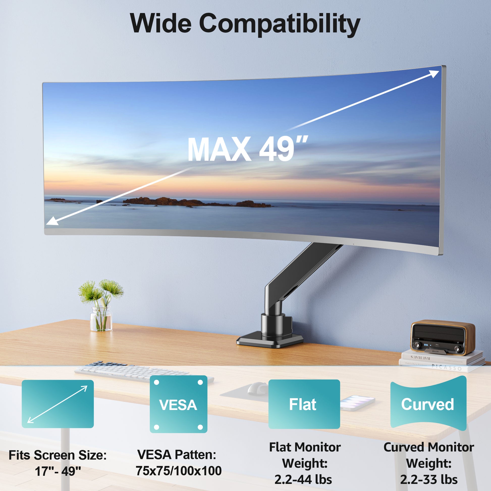 MOUNT PRO Heavy Duty Monitor Arm for 49 inch Ultrawide Screen up to 44 lbs, Single Desk Computer Mount Curved Monitor Stand for Samsung Odyssey G9, Adjustable Gas Spring VESA Mount 75x75 100x100