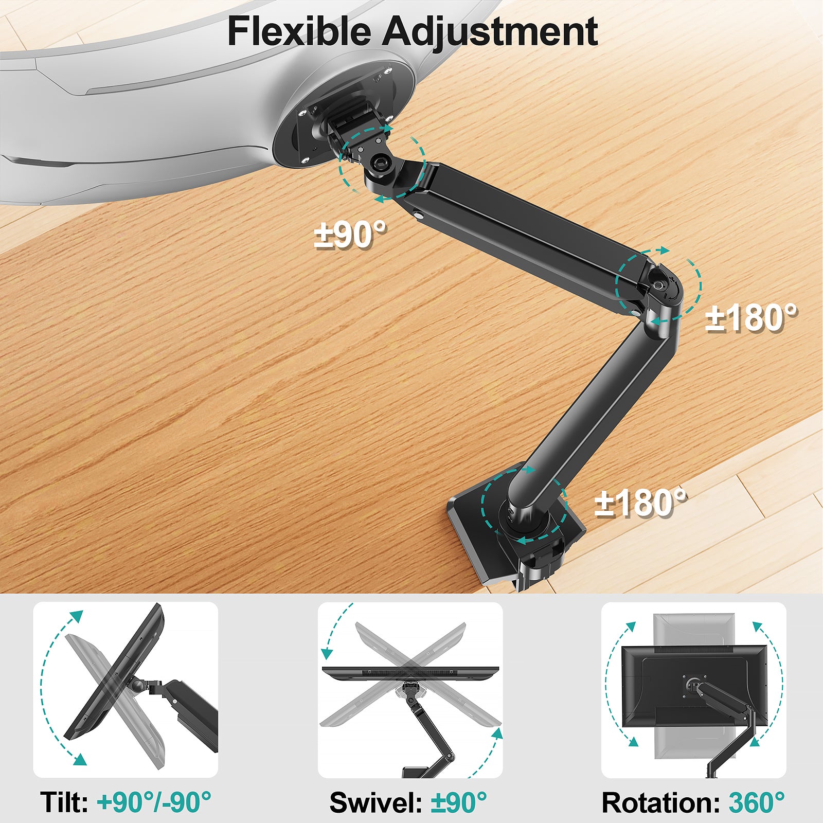 - Full Motion Control - This vesa monitor mount's arm can be raised to 17.3" and extended to 21.7". Additionally, it can rotate 360° from portrait to landscape, swivel 180° to view the screen from various sitting positions, and tilt up to -90° or +90° to reduce screen glare. As a adjustable monitor stand, it helps to customize your setup, whether you’re gaming, working, or multitasking.