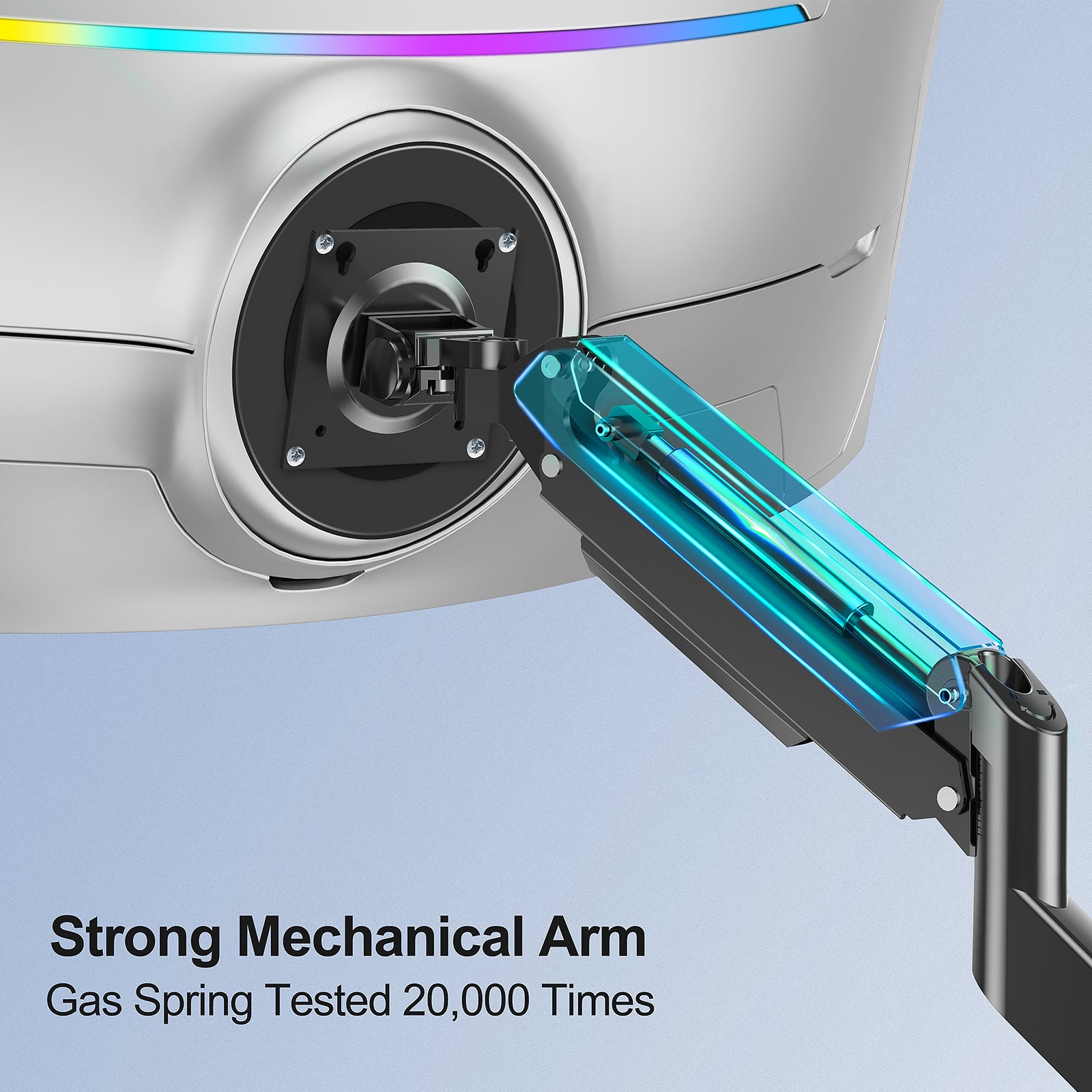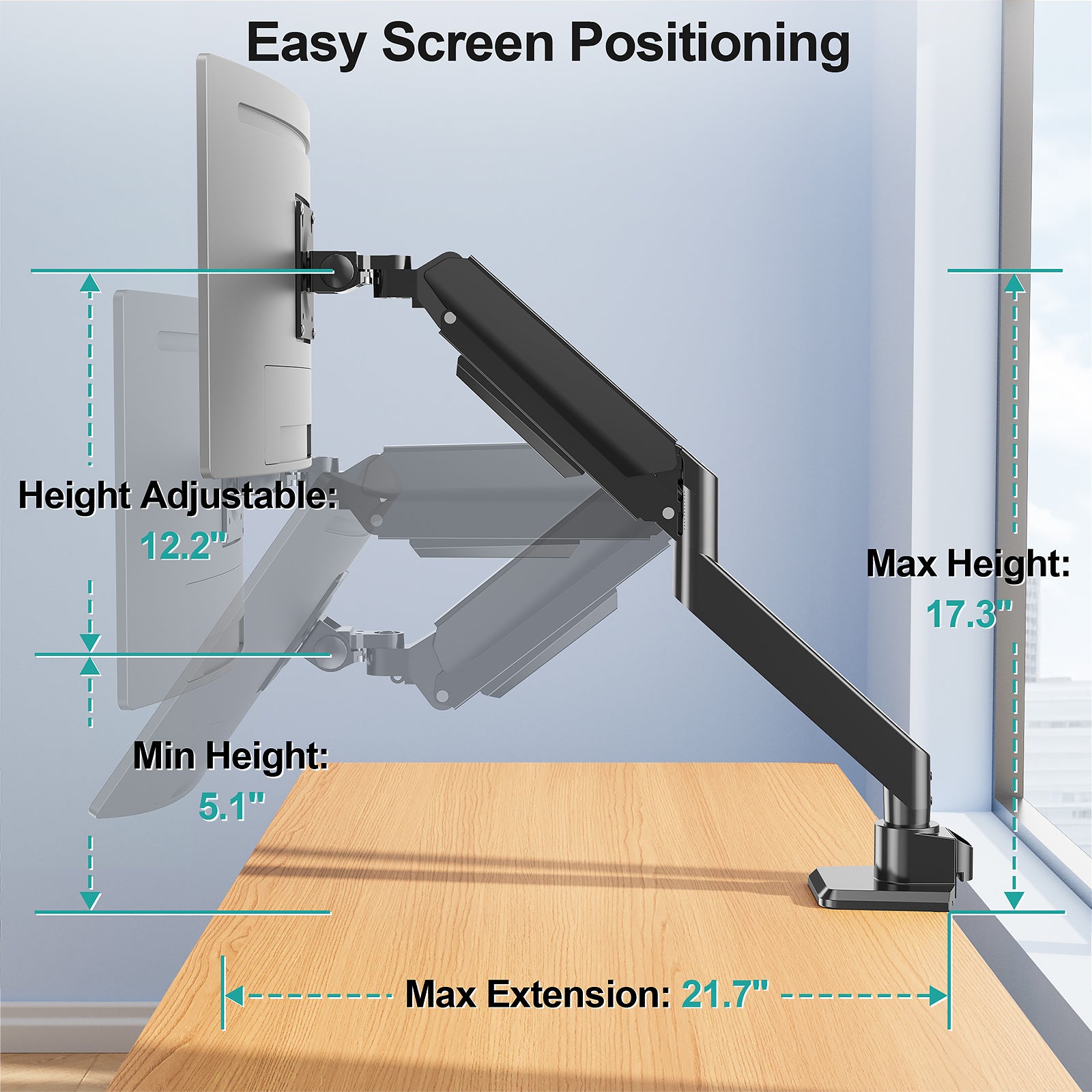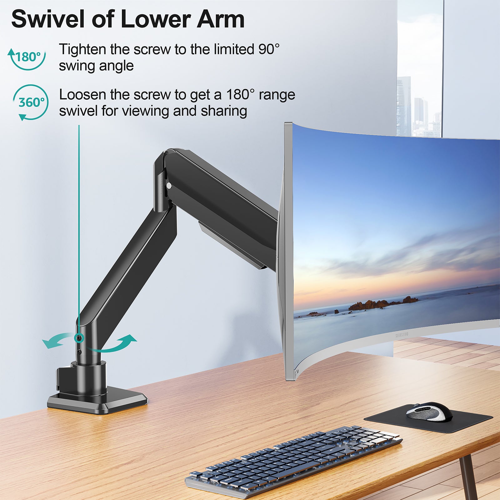 - Free Up Desk Space - This single premium curved monitor mount features with a sturdy arm which ifts screen upward to free up a room for keyboards, notebooks, or that coffee mug, effectly turns clutter space into a clean and modern workspace. Built-in cable management hide the messy wires in the arm, keeping in a neat and organized look.