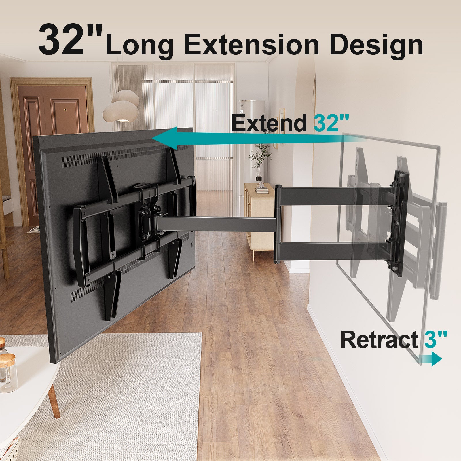 - 32" Long Extention TV Mount: The long arm TV wall bracket extends 32" from the wall for versatile viewing, and retracts to a sleek 3'' to save space while maintaining aesthetics. The long arm design and swivel function make the viewing more flexible and versatile