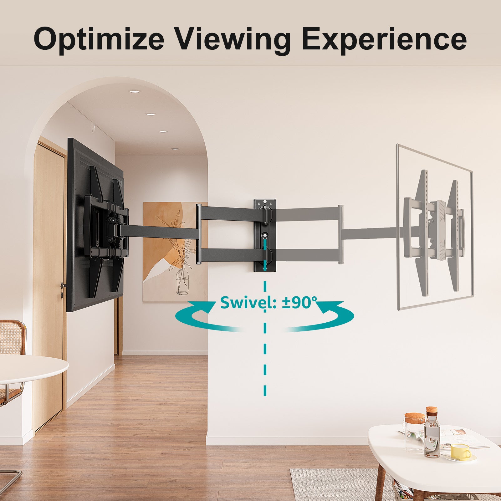 - Ultimate Viewing Experience: Articulating TV wall mount features +/-90° smooth swivel to cover different viewing area without moving the whole mount. Features +5°/-13° tilt to reduce glare and +/-3° post-install leveling to precisely align the TV even after installation. Upgrade your viewing experience today