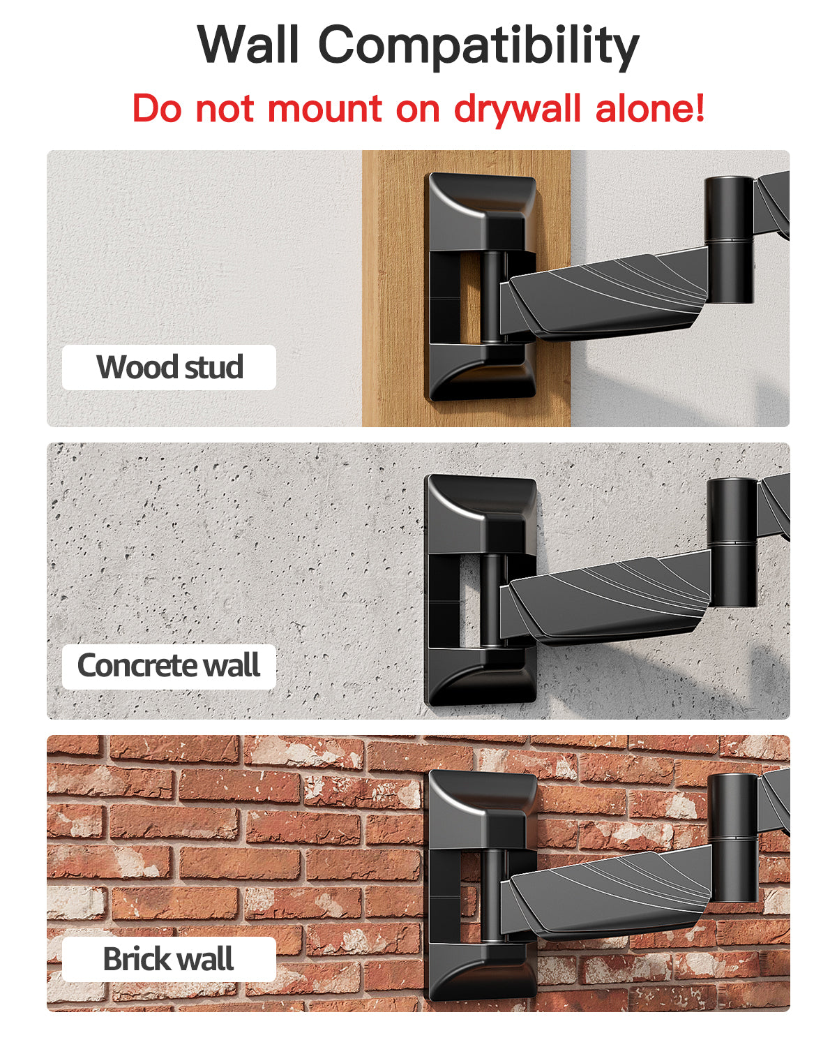 - Effortless Installation: The pc monitor wall mount includes detailed instructions and labeled hardware for hassle-free installation. The wall mount monitor stand can be installed on 3 wall types including wood stud walls, solid concrete, and brick walls. Please verify the wall type before the wall mount purchase. NOTE: DO NOT install into drywall alone!