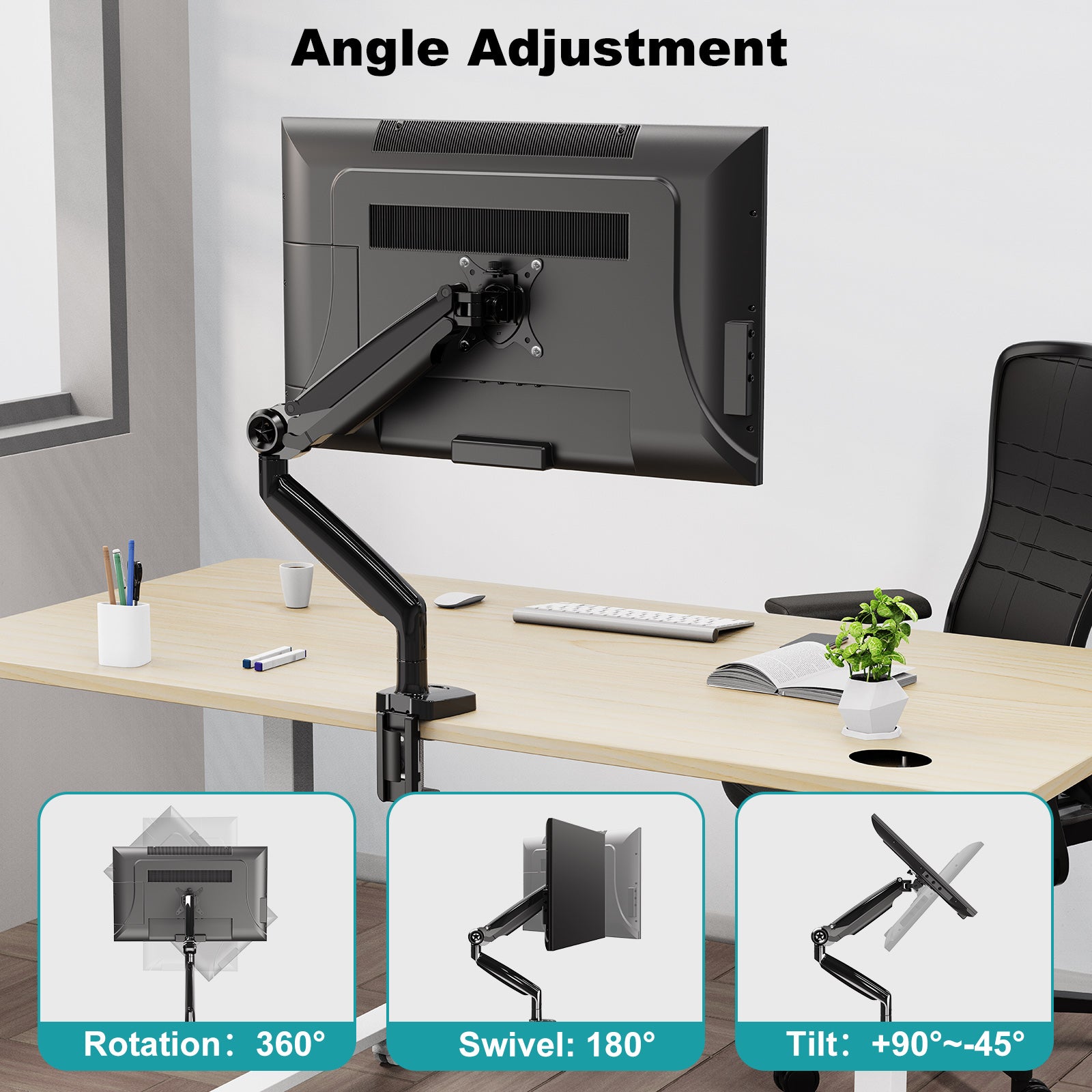 - Fully Adjustable Mount - The monitor arm desk mount allows the screen to tilt up 90° down -45°, swivel 180°, and rotate 360° from landscape to portrait. Easy to find an optimal view angle your need, and you will not bend your neck to watch the screen, which can reduce strain on your neck, shoulder, and back, and maximize your comfort and pleasant viewing experience.