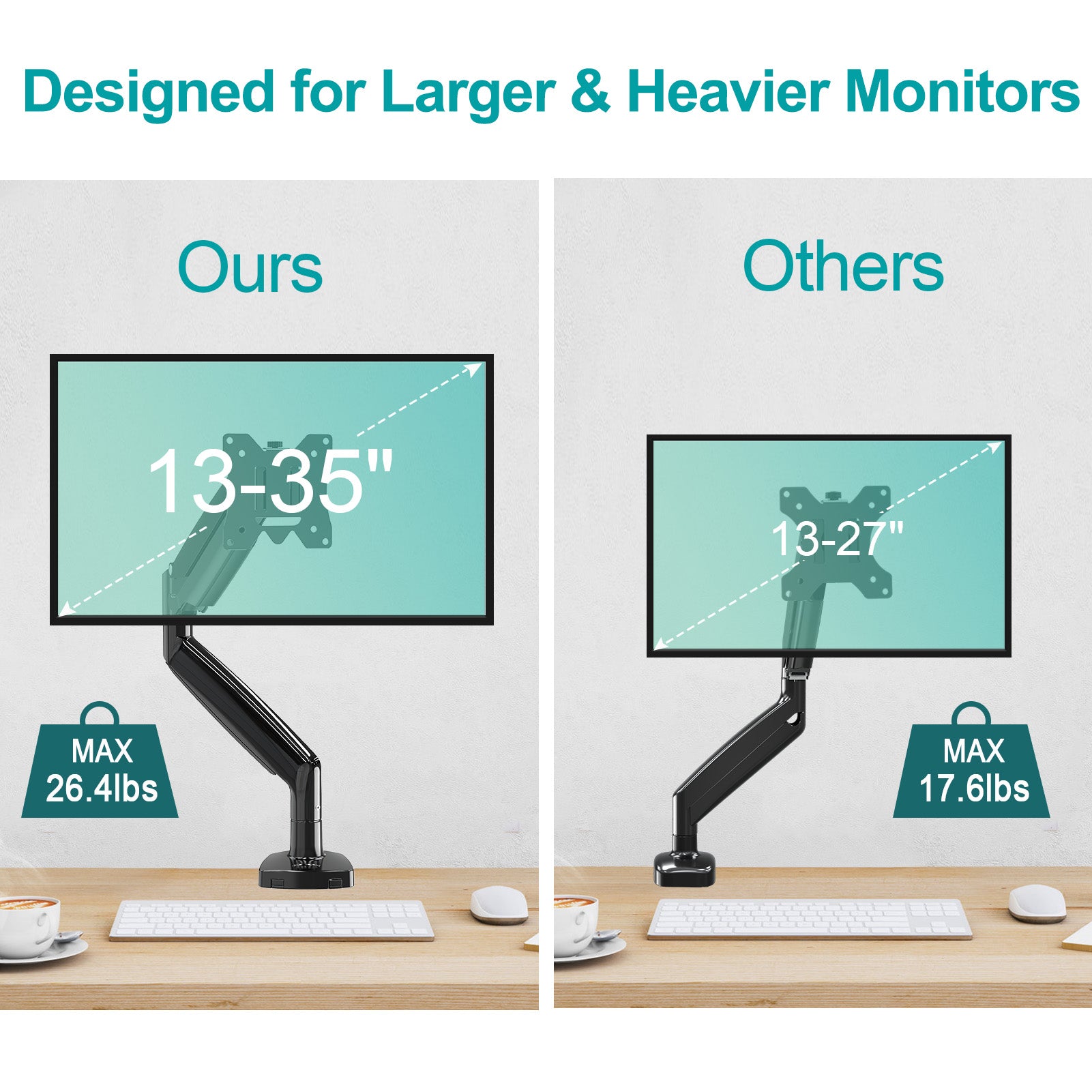 - Excellent Quality and design - As more and more large and heavy monitors and deeper tables are available, but common monitor stands can't support them, this MOUNT PRO upgraded monitor mount is here to help. Larger monitor arms and bases provide upgraded loading capacity. Securely and easily hold monitors up to 35 inches and supports 4.4-26.4lbs monitors. Compatible with VESA 75x75mm and 100x100mm.