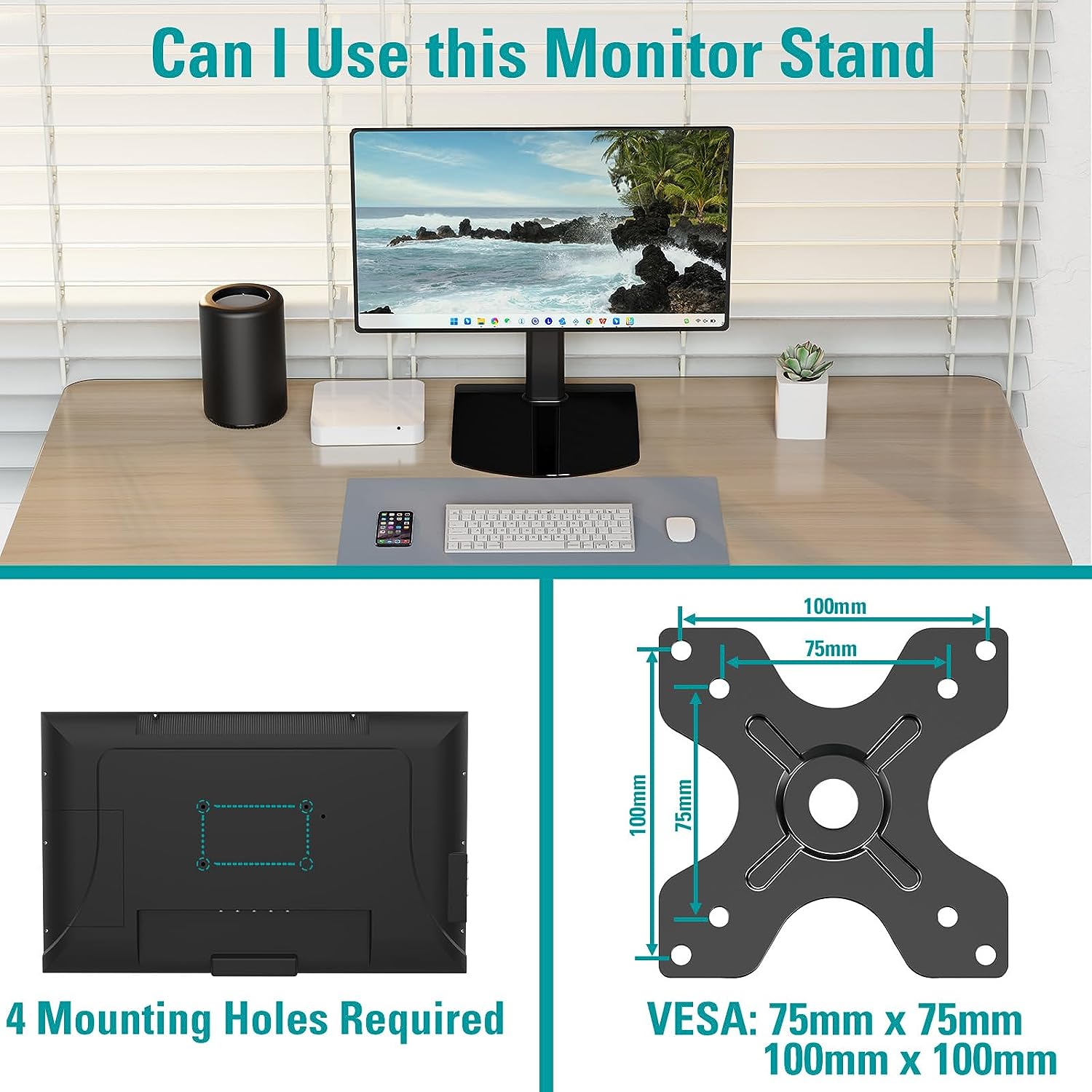 - Solid Support - This single monitor desk mount is designed with a tempered glass base that easily holds your monitor securely and steadily to the desktop. Monitor arm can support up to 22 lbs in weight and widely fits 13, 15, 17, 19, 21, 23, 27, 30, and 32 inch LCD LED flat or curved screens, compatible with VESA 75x75mm or 100x100mm backside mounting holes.