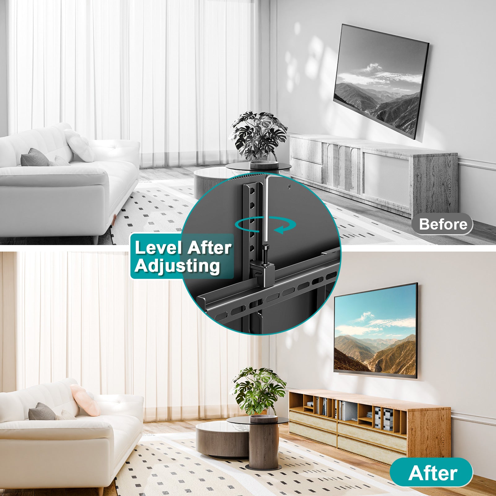 - Tilt TV to Reduce Glare-The TV mount bracket offers a 9° tilting function. You can adjust your TV down 9° easily to reduce glare and enjoy the perfect viewing angle when watching TV