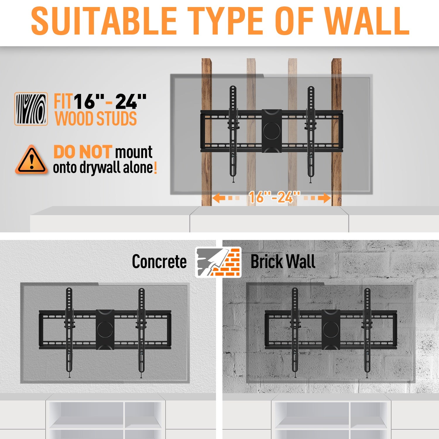 - Versatile Compatibility——The mount supports VESA patterns from 75x75mm to 600x400mm, ensuring compatibility with a wide range of TV models. It can be mounted on wood studs (8” to 24”), as well as concrete or brick walls. Please make sure your TV’s pattern, weight, and size are compatible before purchasing.
