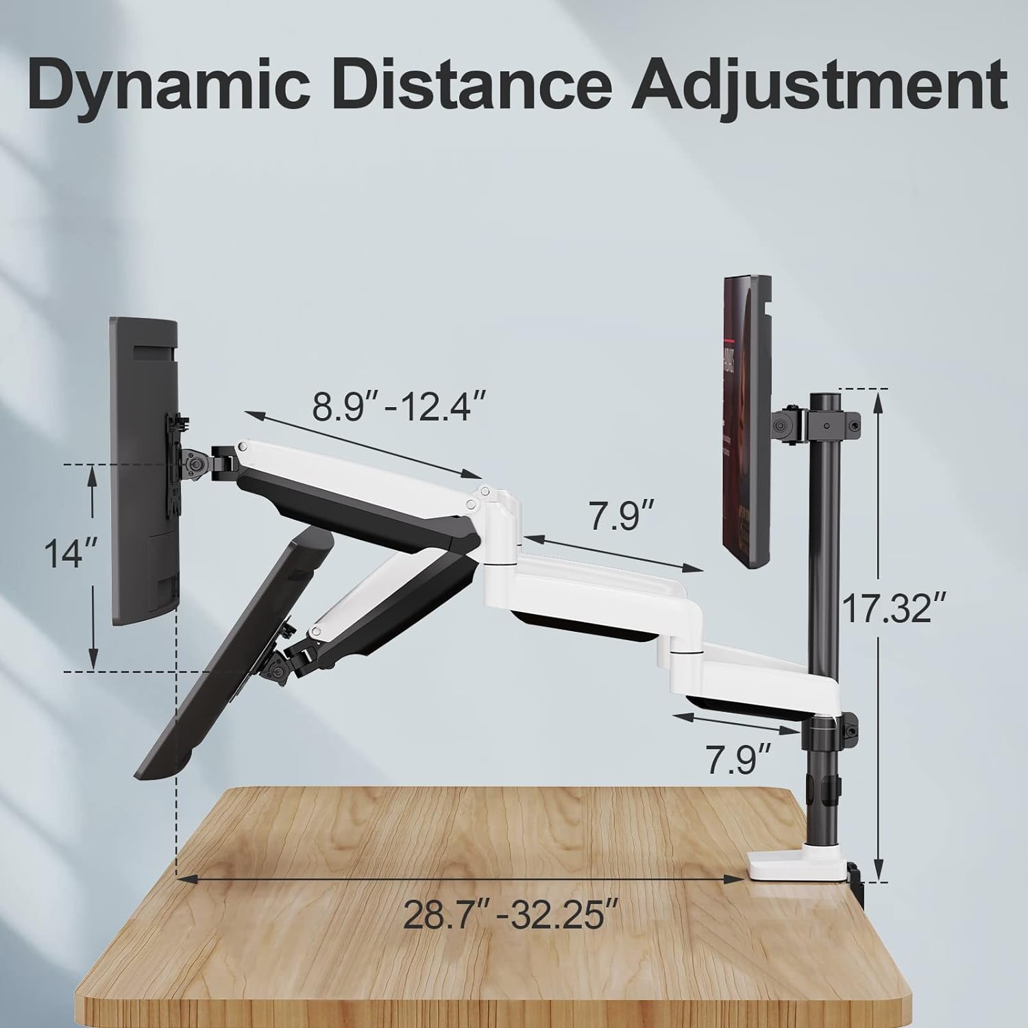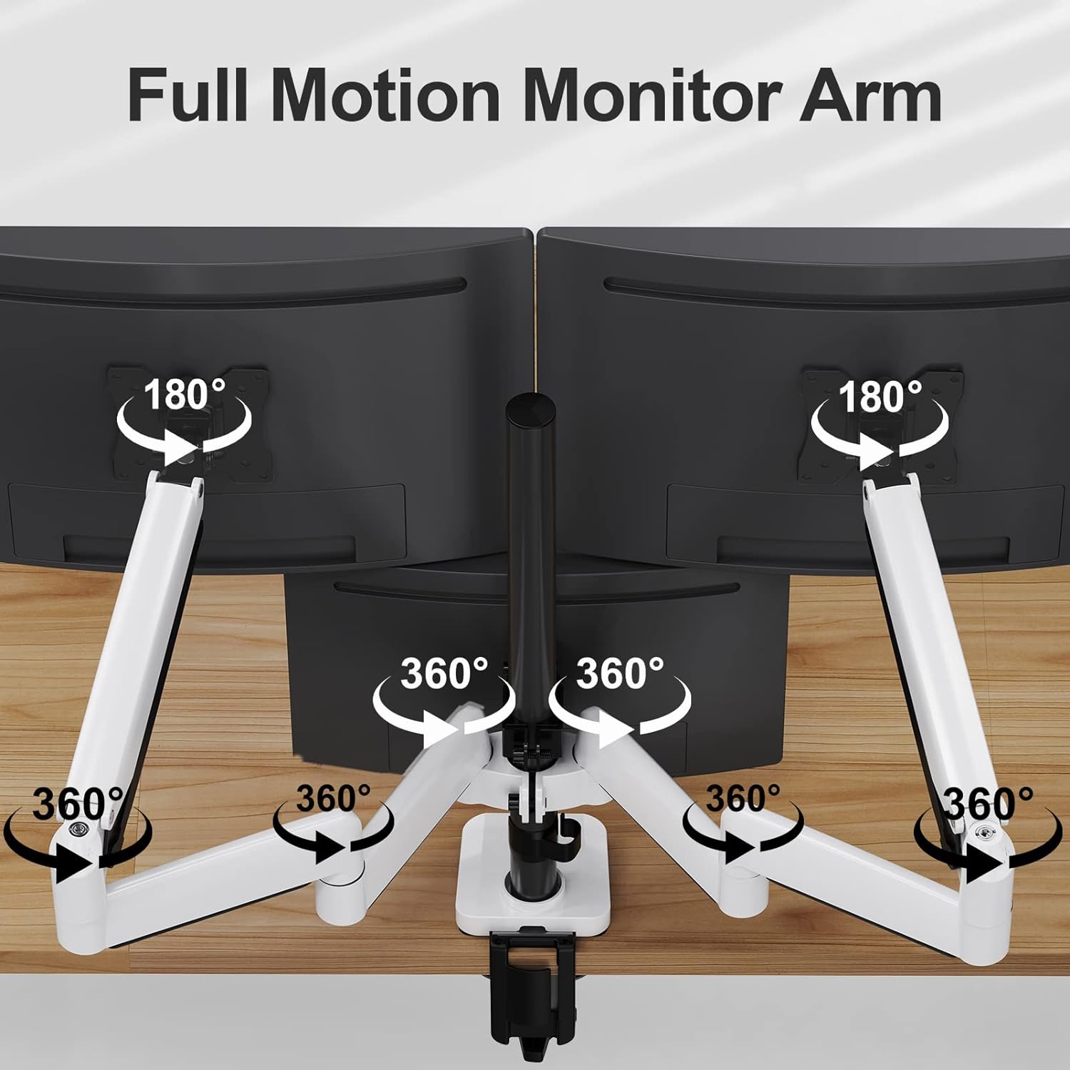 - Optimize Your View - Our fully adjustable triple monitor arm offers a wide range of movement. Supports screen rotates 360° for landscape or portrait orientation, swivels 180° to share your display, and tilts up 90°/down 45° for better viewing. Plus, the 2 gas spring arms can easily extend, retract, and adjust the height dynamically. With multiple screen combinations, you can easily find the optimal viewing angle and position for comfortable work.