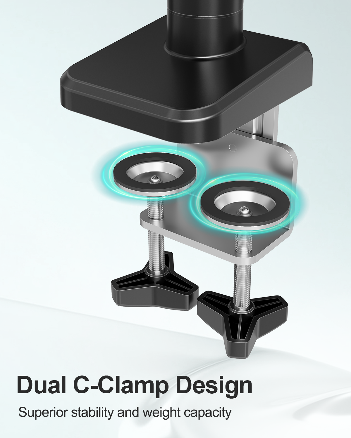 - Excellent Stability with Wider C-Clamp - Unique wider C-clamp design, provides larger contact area with the desktop, forming a more stable support structure. It supports two mounting options: a C-clamp for desks 0.39"-2.76" thick and a grommet mount for 0.39"-2.36" thick desks.