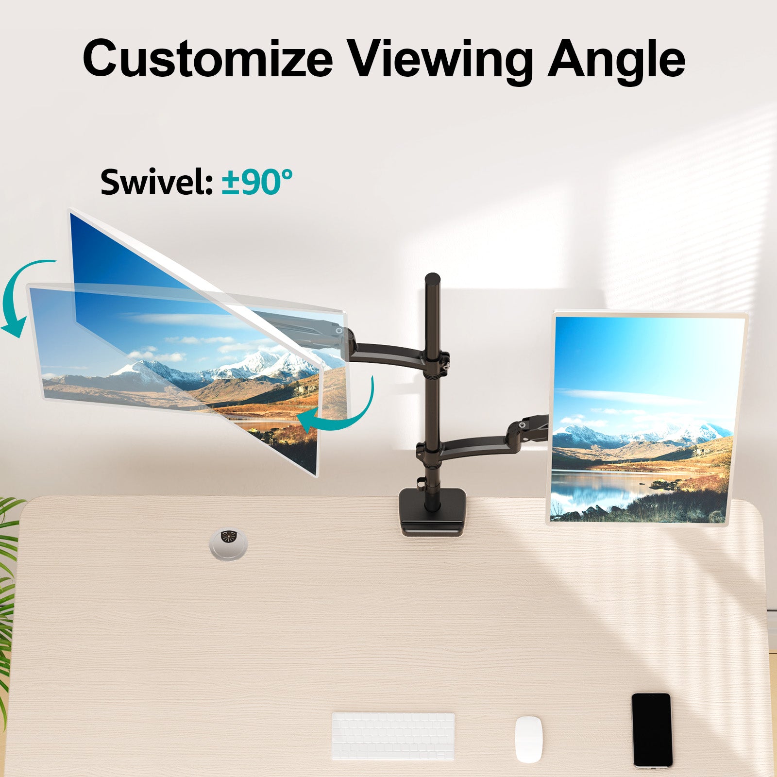- Customize Your Screen Angle - Our vertical monitor mount offers a variety of angles to adjust your screens. It can tilt 90° up and down for the ideal angle and rotates 360° for easy switching between portrait and landscape mode. The swivel ±90° adjustment function on horizontal orientation allows you to watch monitor from different seat positions. You'll have the flexibility to adjust your viewing experience to your liking.