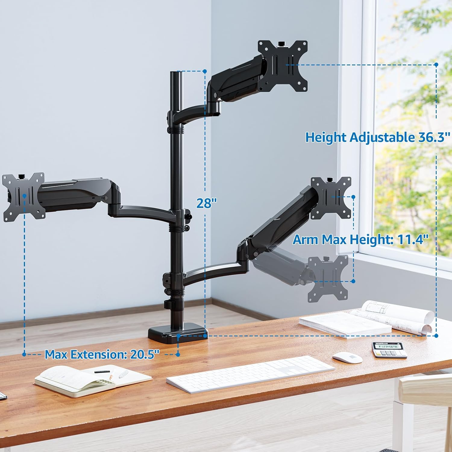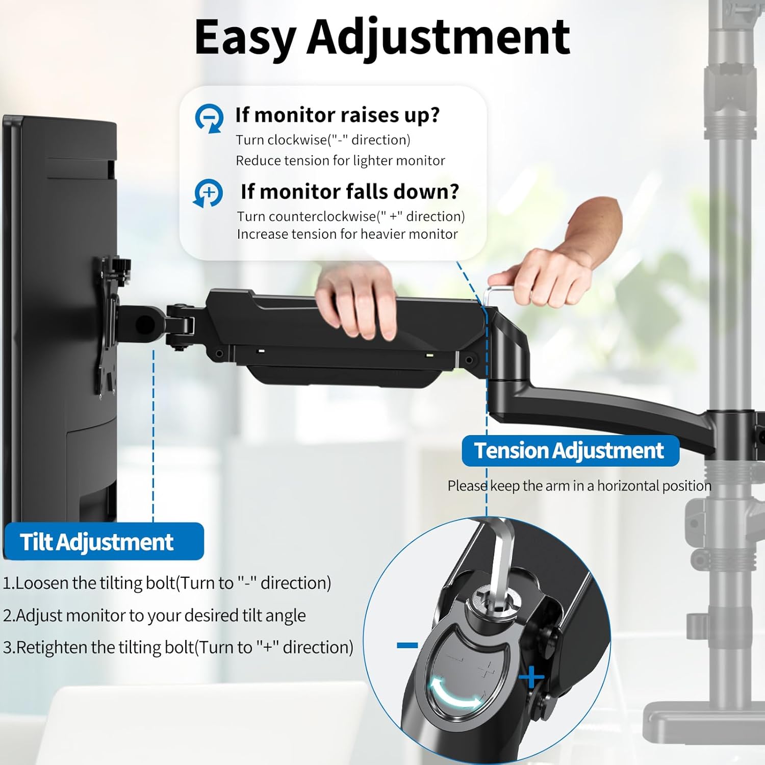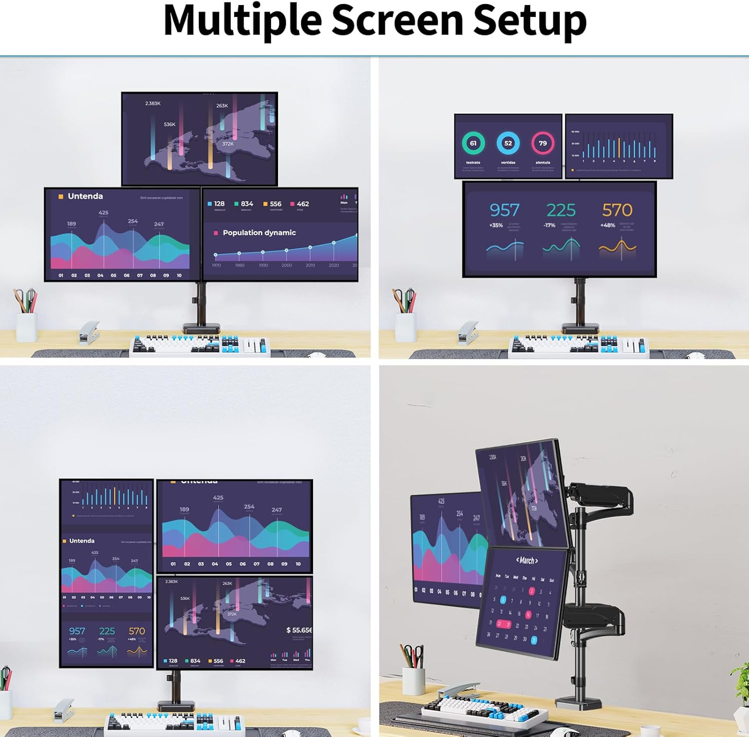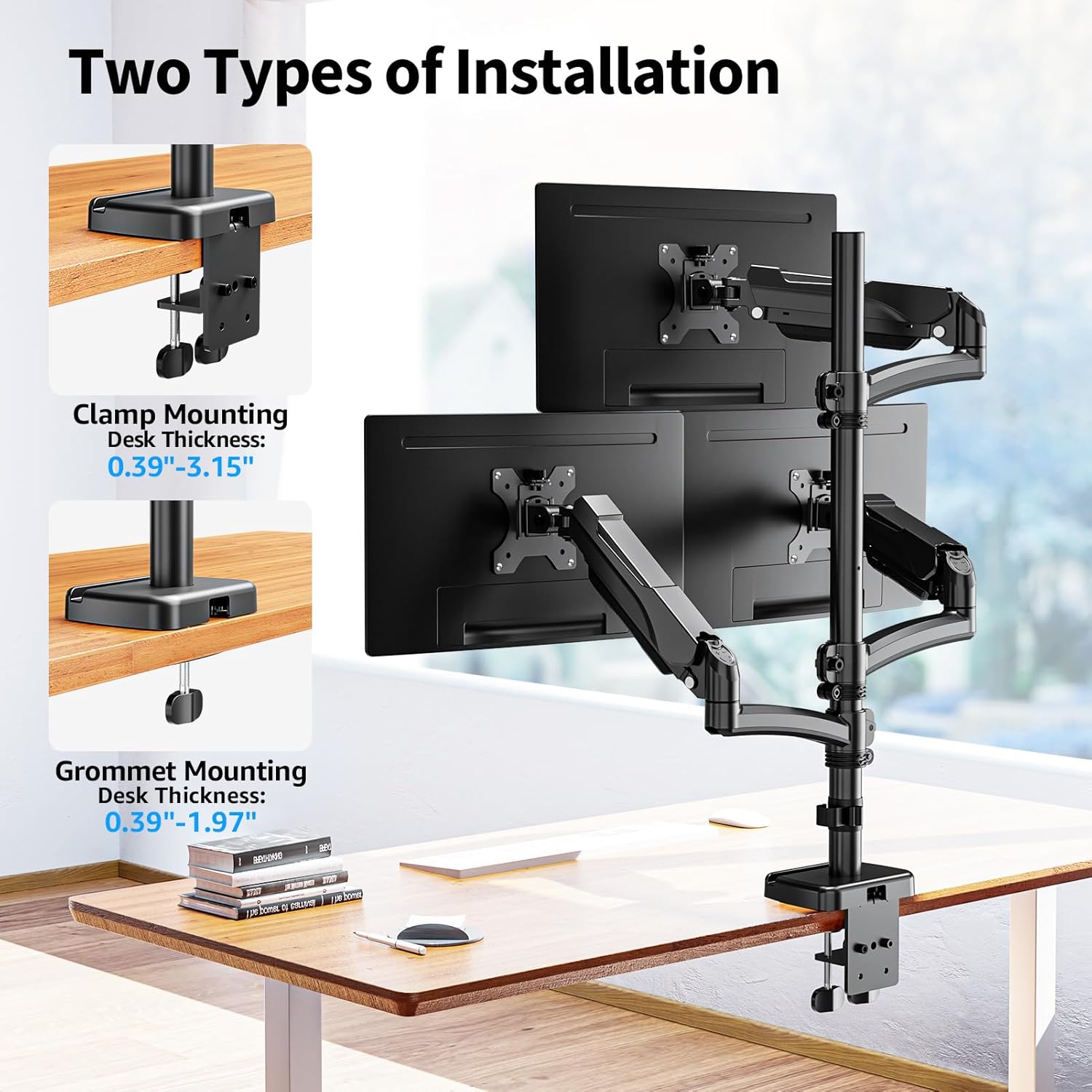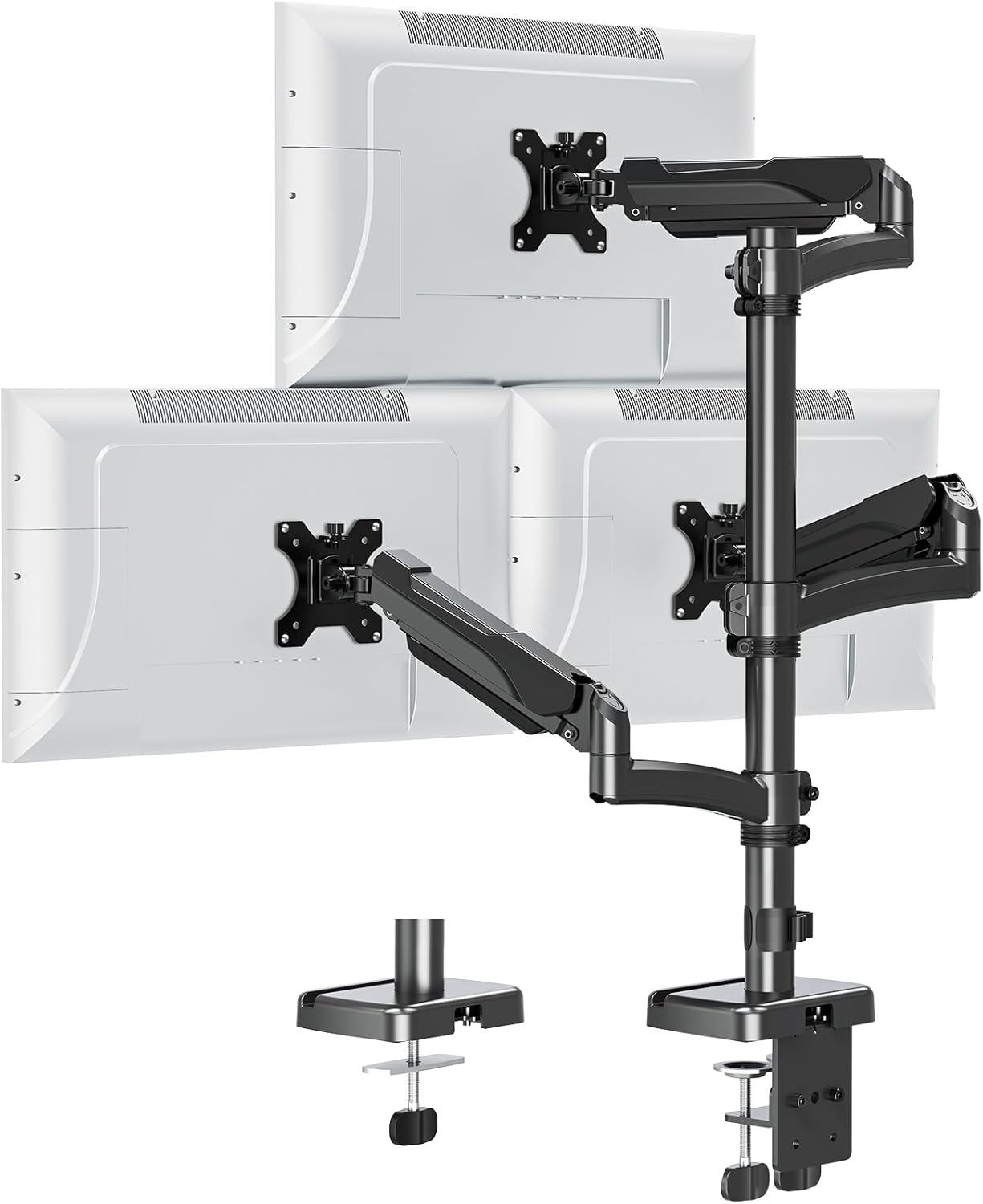 - Ergonomic Design for All-Day Comfort - The adjustable triple monitor mount tilt your screen from +90° to -90°, swivel 180°, and rotate 360° from landscape to portrait. This full motion monitor desk mount also can be positioned or stacked in many different ways. The monitor gas spring arm help to customize your screen angle effortlessly, reducing neck and eye strain.