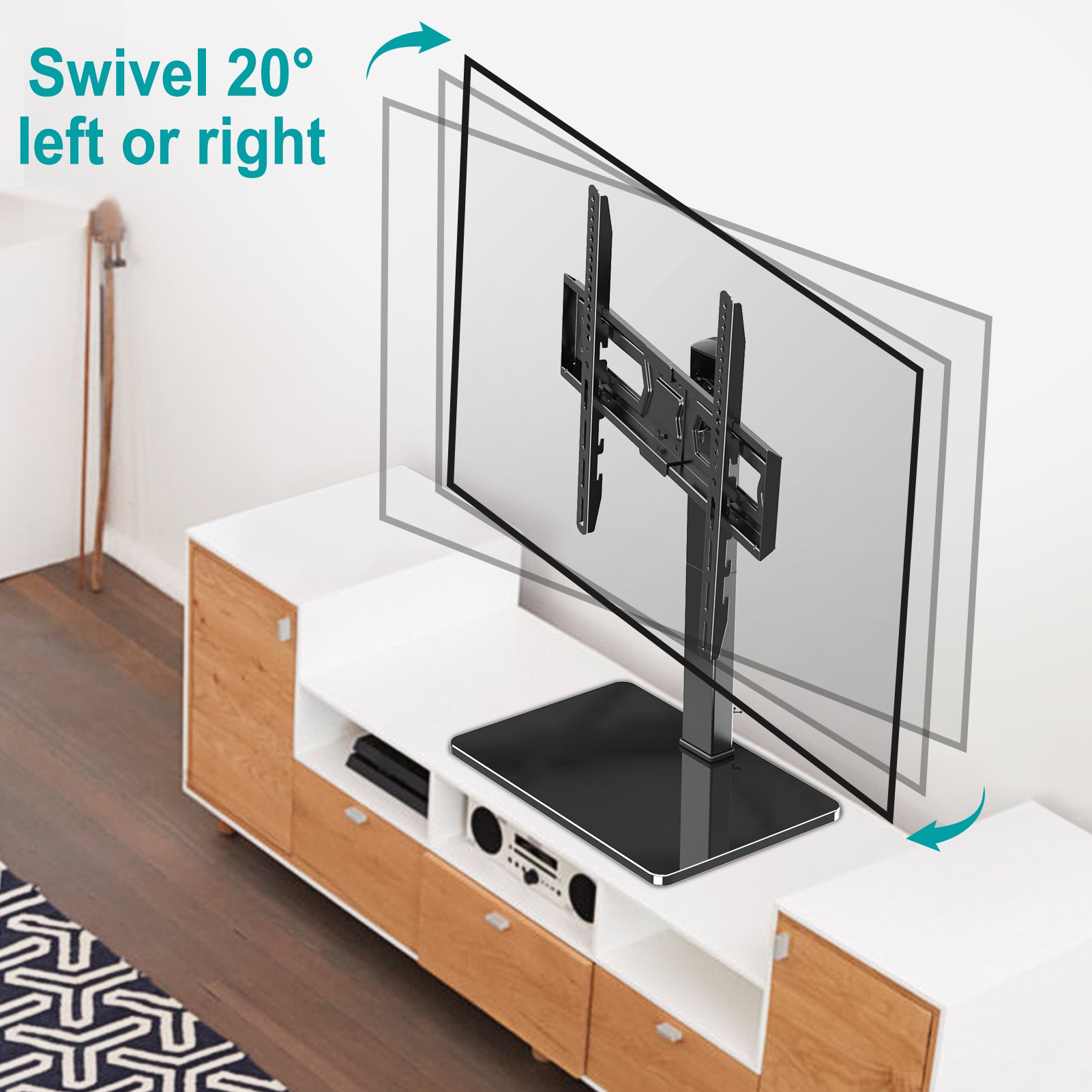 - SWIVEL & TILTING ANGLE ADJUSTMENT - This table top TV mount offers 0° to +5° tilt; The TV plate can easily swivel 20 degrees left or right, making it possible for you to get an optimal viewing without being restricted by the location.
