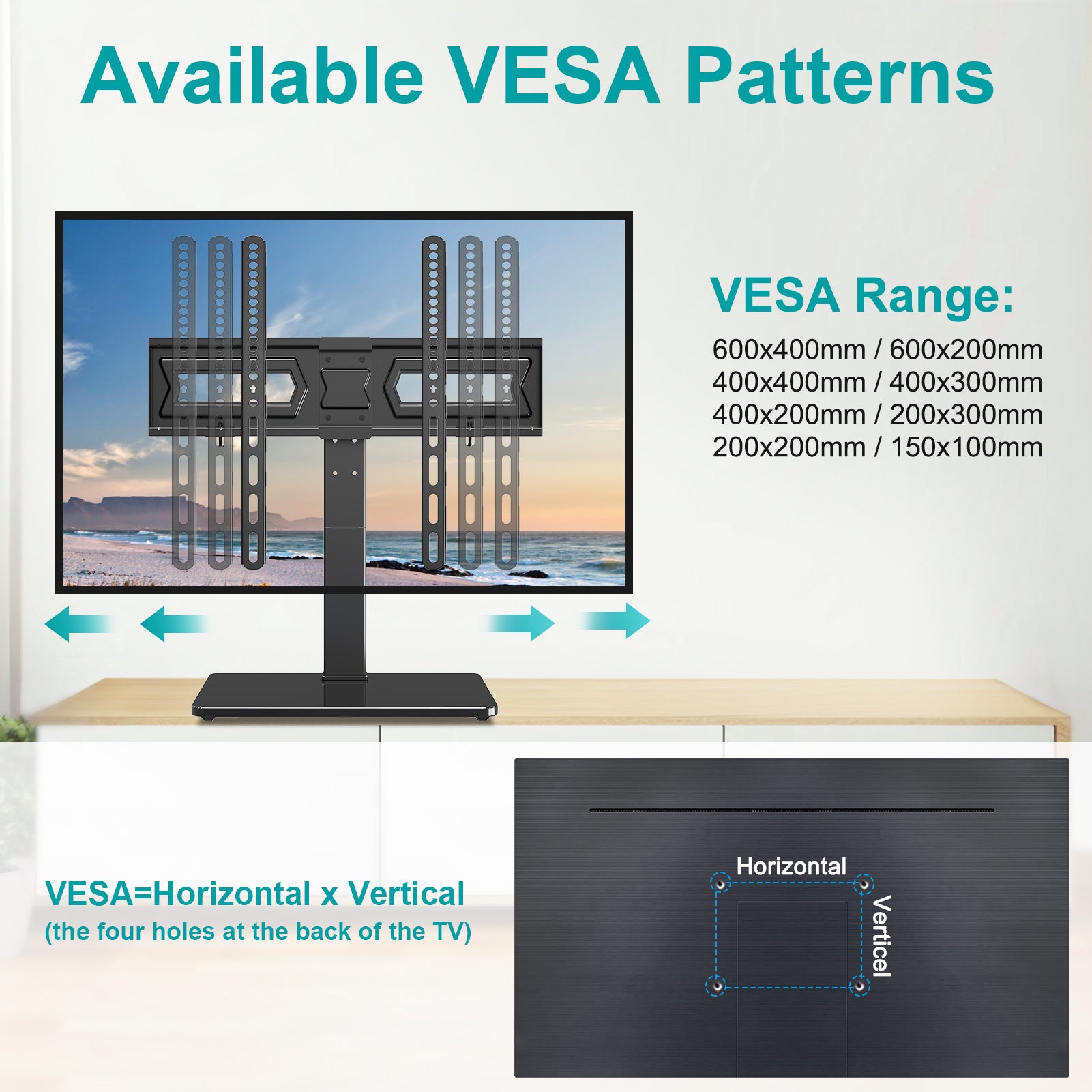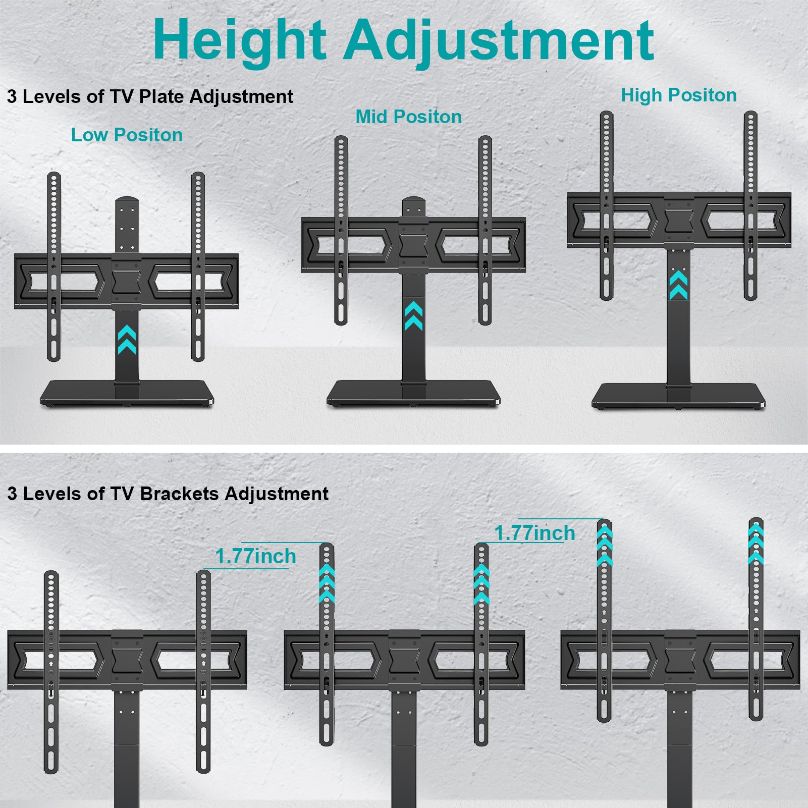 - HEIGHT ADJUSTMENT - This table top TV stand has 2 options to adjust height up to 9 levels. The central support pillar features 3 levels of height setting and each can be adjusted by 2.16". The TV mounting brackets can also be adjusted at 3 height levels by 1.77" to satisfy different applications or TV sizes.