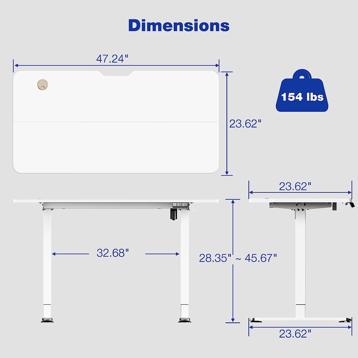 - Reliable Support - Featuring T-shaped desk leg design, thickened metal legs and solid wood tabletop, this adjustable desk electric measures at 48" x 24", complete with a spacious work surface that holds up to 154lbs. The standing office desk works its magic to help relieve stress from sitting and improves your posture as you work or browse the internet.