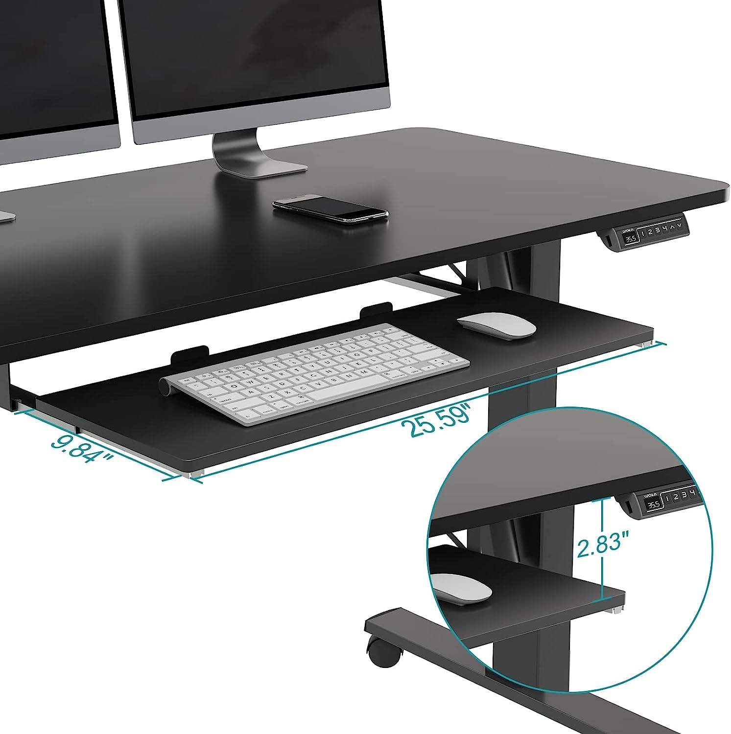 - Smooth Keyboard Tray: A convenient pull-out keyboard tray (25.59" x 9.84") keeps your mouse and keyboard organized and accessible. It can provide ergonomic comfortable typing experience during a long work day. It fits up to a 2.83" height keyboard boosting your productivity working from home.